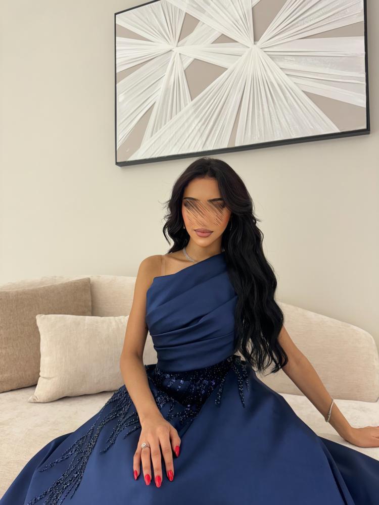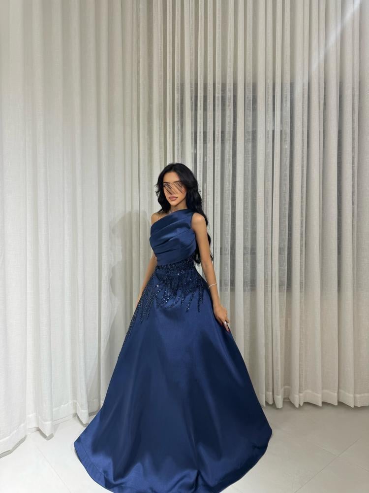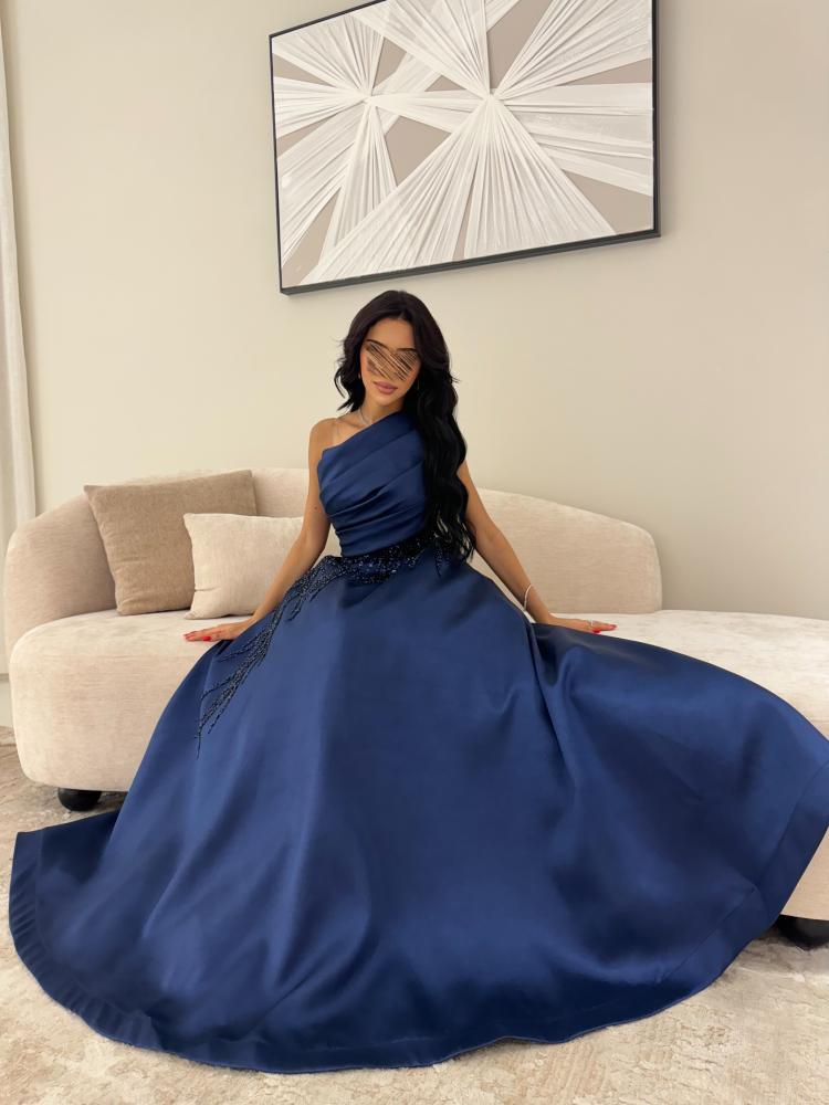 فستان ستان طویل ون شولدر بكسرات وتطريز انيق