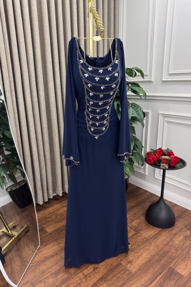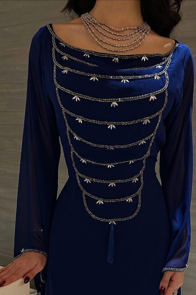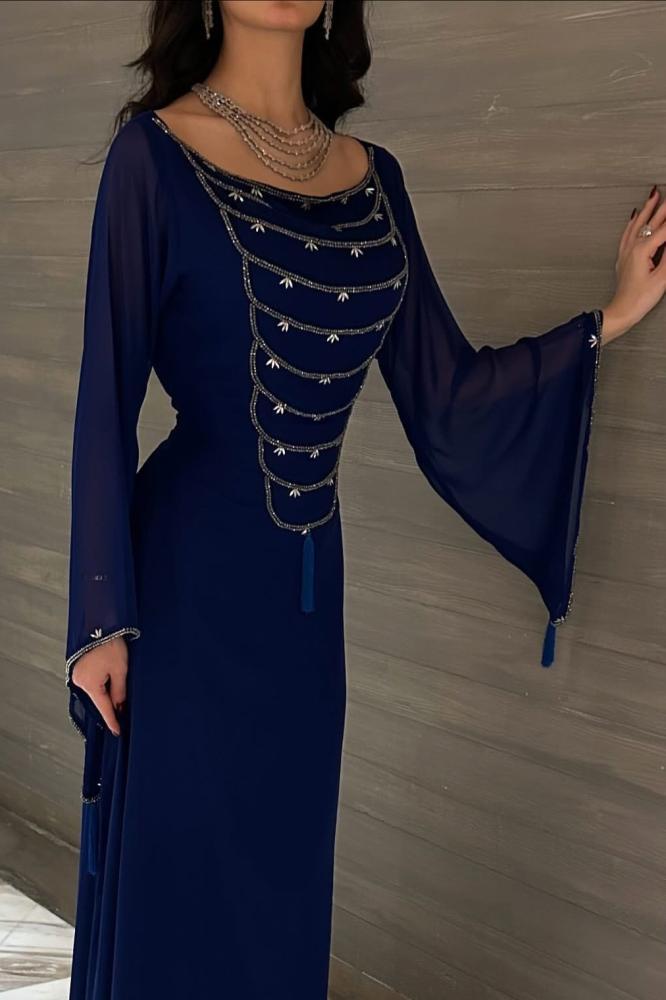 فستان ناعم مزين بالخرز باكمام بالون ازرق
